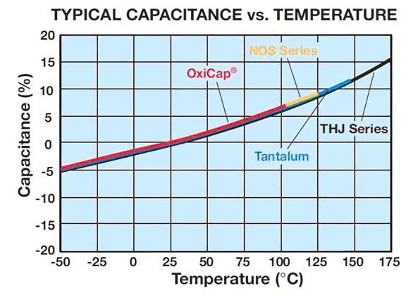 鉭電容器的電容隨溫度變化而發(fā)生變化。這種變化本身就是一個小的程度上依賴額定電壓和電容的大小。從下面的溫度曲線圖上可以看出在工作溫度范圍內(nèi),鉭電容和鈮電容的容量會隨著的上升而上升。