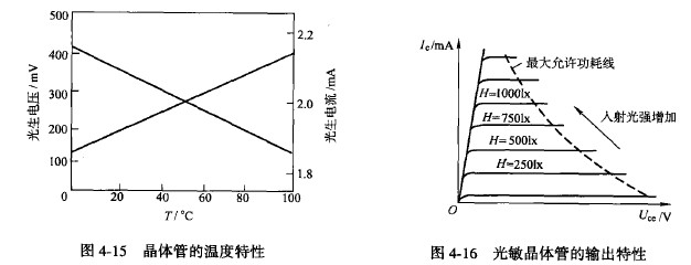 光敏晶體管的輸出特性與一般晶體管的輸出特性相同,其差別僅在于參變量不同,一般晶體管的參變量為基極輸入電流,而光敏晶體管的參變量為射入光的照度,如圖4-16所示。