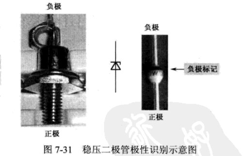 識別穩壓二極管的各引腳有下列兩種方法:(1)通過穩壓二極管外形特征和管殼上的各種標記,可以識別各種穩壓二極管的正、負引肝鄧。例如,有的穩壓二極管上直接標出圖形符號,塑料封閉的穩壓二極管有標記的一端為負極,金屬封裝穩壓二極管半圓面的一端為負極,平面的一端為正極,如圖7-31所示。(2)用萬用表來檢測的方法。穩壓二極管也是一個PN結的結構,所以運用萬用表歐姆擋測量PN結的正向和反向電阻可以分辨正、負引腳。