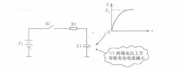如圖5-5所示是電容兩端電壓不能突變的特性示意圖。E1是直流電源,S1是開關(guān),R1是電阻,C1是電容,這是一個(gè)直流電源對電容C1充電的電路。