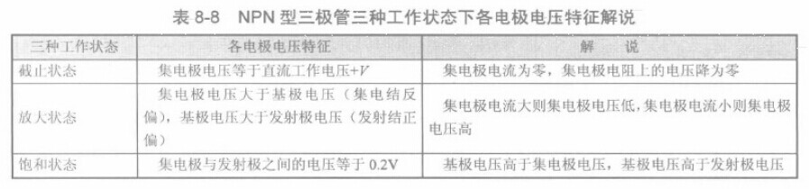如表8-8所示是NPN型三極管三種工作狀態下各電極電壓特征解說,根據各電極電壓特征可以判斷電路處于什么工作狀態。
