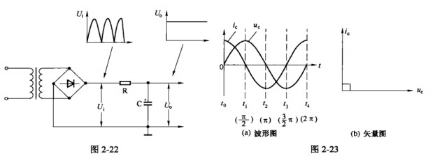 (3)移相。由于通過電容器的電流大小取決于交流電壓的變化率,因此電容器上電流超前電壓90度,具有移相作用,如圖2-23所示。利用電容器上電流超前電壓的特性構成的RC移相網絡如圖2-24所示。圖2-24(a)中,輸出電壓U0取自電阻R,由于電容器C上電流I超前輸入電壓U1,因此U0超前U1一個相移角