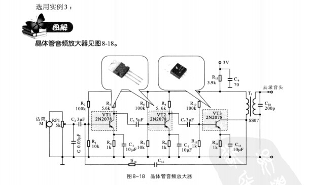 晶體管音頻放大器中,選用的三極管2N2078為美國產(chǎn)的有兩個(gè)PN結(jié)的晶體三極管,其中VT1和VT2為PNP型晶體三極管,VT3為NPN型晶體三極管。該放大器為一種是小型錄音機(jī)的音頻信號放大器,話筒信號經(jīng)電位器RP1后加到晶體管VT1上,該晶體管是一個(gè)共發(fā)射極放大器,音頻信號經(jīng)三極放大后加到變壓器T1的初級線圈上。經(jīng)變壓器T1將音頻信號送往錄音磁頭,同時(shí),VT3的集電極輸出經(jīng)R18、C16反饋到VT1的基極,用以改善放大器的頻率特性。在代換時(shí)應(yīng)注意晶體三極管的類型和型號。選擇時(shí)選擇同類開型晶體管替換。