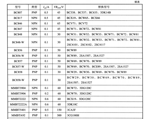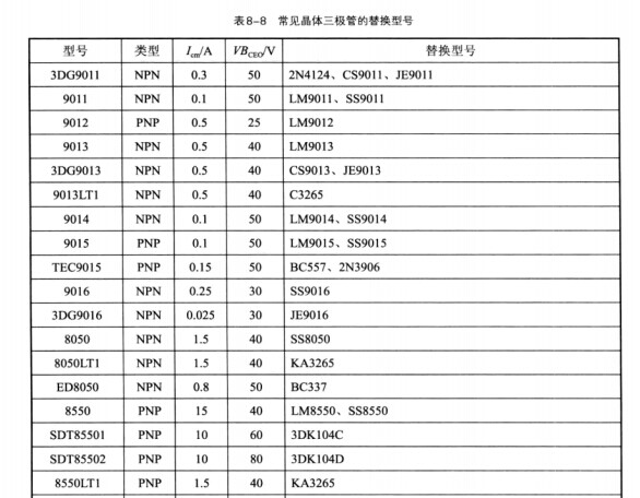 晶體三極管的型號和種類較多,不同種類晶體三極管內(nèi)部的參數(shù)也有所差異,若在代換時(shí),應(yīng)盡量選用同型號晶體三極管進(jìn)行代換,有些型號的晶體三極管若代換時(shí)無法找到同型號的,也可用其他型號進(jìn)行代換,常用型號晶體三極管的代換見表8-8所列。